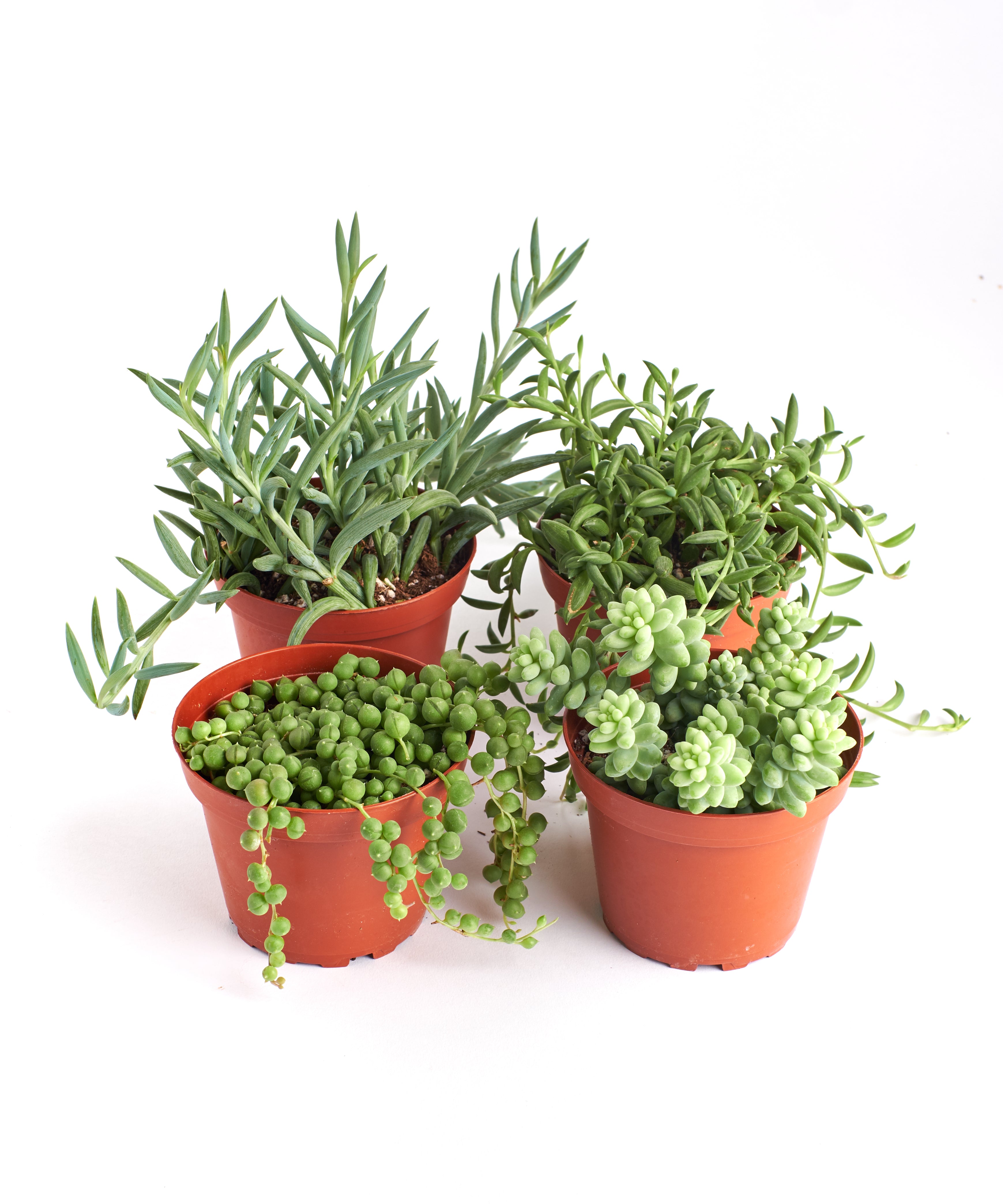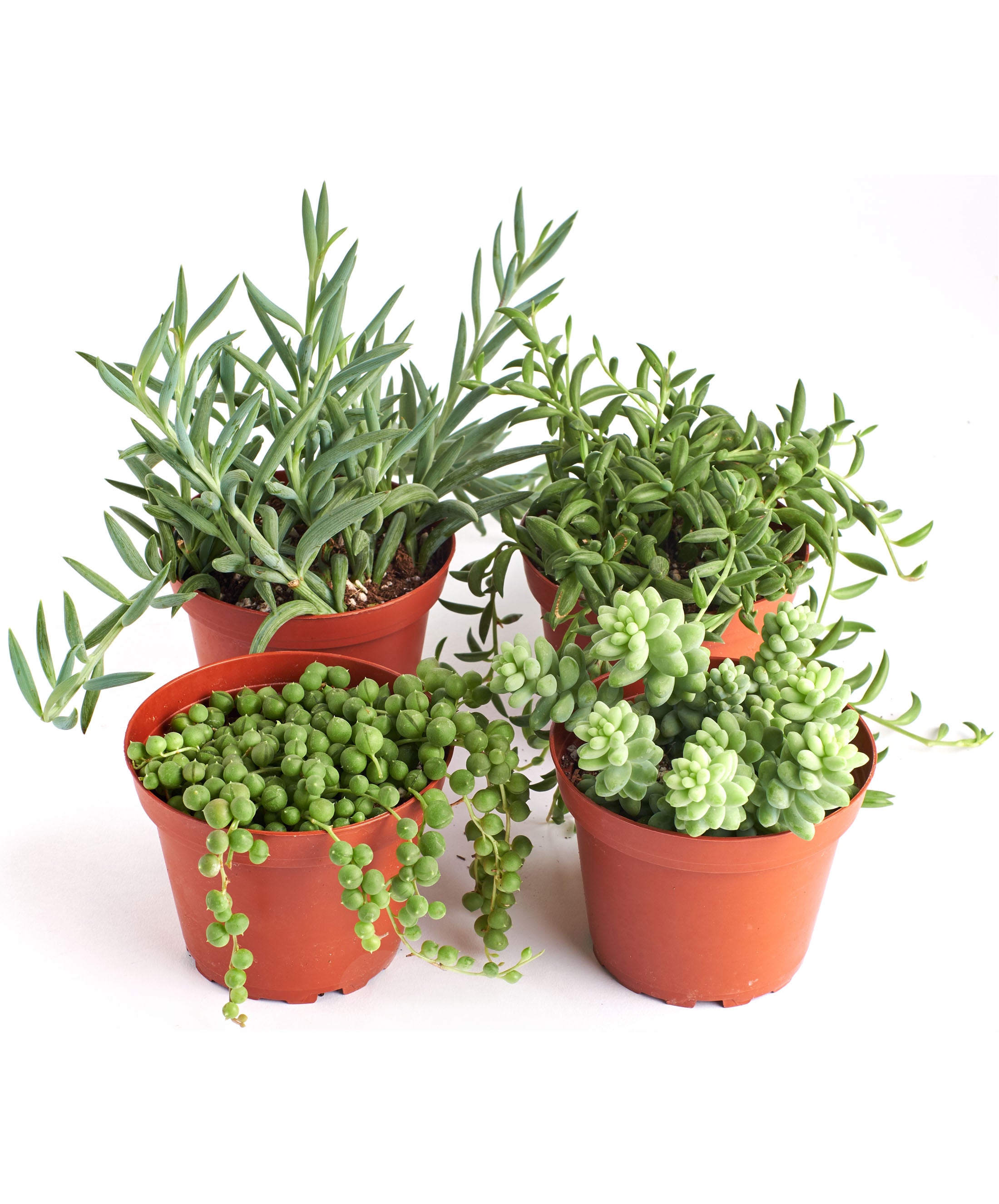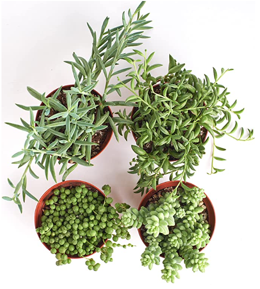 This four pack of indoor plants includes a delightful assortment of unique and trailing succulents, each potted in 4 inch nursery pots. The pack features a String of Pearls (Senecio rowleyanus), a String of Bananas (Senecio radicans), a Fishhook Plant (Senecio radicans glauca), and a Burro's Tail (Sedum morganianum). These captivating succulents are known for their cascading growth habits, making them perfect for hanging displays or adorning shelves. With a variety of shapes, colors, and textures, this plant pack adds an instant touch of natural elegance and charm to your living spaces. Whether you're a seasoned plant enthusiast or a novice, this diverse selection is a versatile and delightful choice to enhance the aesthetics and ambiance of your home or office.